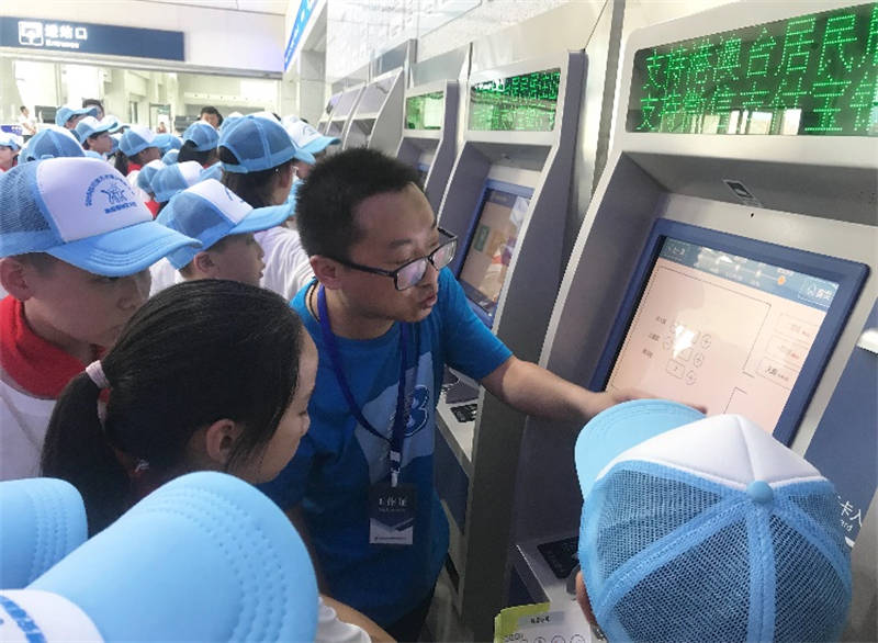 在雅安火車站行政辦公樓旁的操場上,運通公司工作人員就雅安火車站相關情況向孩子們進行了簡單介紹,對孩子們提出的問題進行了一一解答。下午4點13分,伴隨響亮的鳴笛聲,一輛動車駛出站臺,孩子們歡呼雀躍,興奮不已。在雅安火車站售票大廳,運通公司員工向孩子們講解了自助購、取票操作流程。