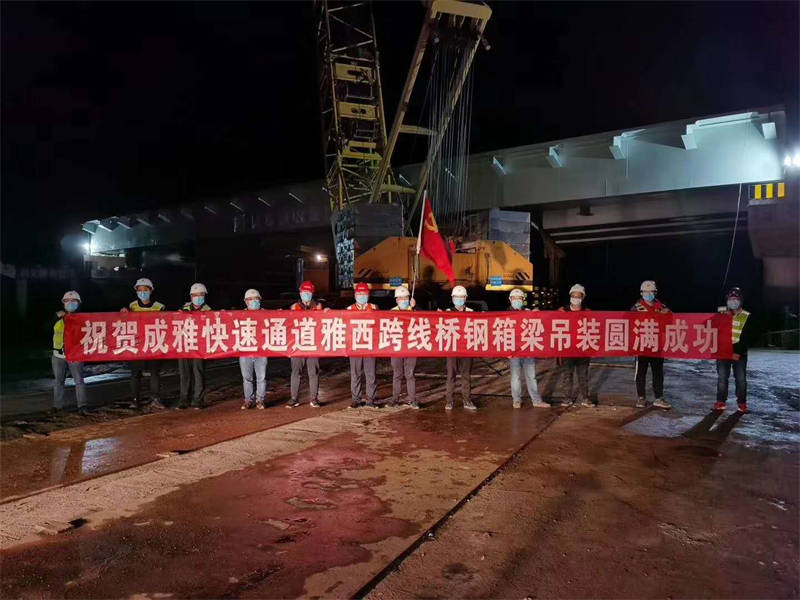 雅西跨線橋是成雅快速通道(雅安段)新建工程重要組成部分,該橋為單跨簡支鋼箱梁橋,全橋設(shè)計鋼箱梁4片,單片重量約140噸、長55余米,體積大、自身重、運輸困難,且投入的大型機(jī)械設(shè)備較多,施工組織難度大。為順利完成架設(shè)任務(wù),市交通局會同市交建集團(tuán)、交建項目管理公司、市公安局交警支隊和各參建單位多次組織召開專題會議,提前謀劃、細(xì)致安排、優(yōu)化組織,制定了施工專項方案和應(yīng)急措施,使整個施工過程按照標(biāo)準(zhǔn)化、程序化、規(guī)范化進(jìn)行施工,為鋼箱梁的成功吊裝奠定了堅實的基礎(chǔ)。