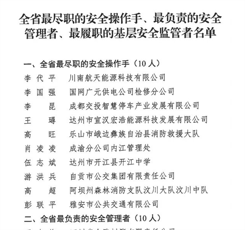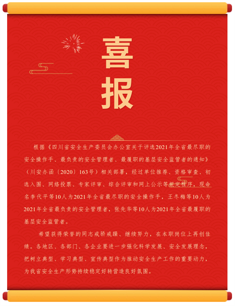 此次評(píng)選活動(dòng),最終命名“全省最盡職的安全操作手、最負(fù)責(zé)的安全管理者、最履職的基層安全監(jiān)管者”各10名。彭聯(lián)平通過(guò)單位自薦、資格審查、初選入圍、網(wǎng)絡(luò)投票、專家評(píng)審、綜合評(píng)審和網(wǎng)上公示層層選拔,最終獲得“2021年全省最盡職的安全操作手”稱號(hào),是雅安市唯一獲此殊榮的個(gè)人。