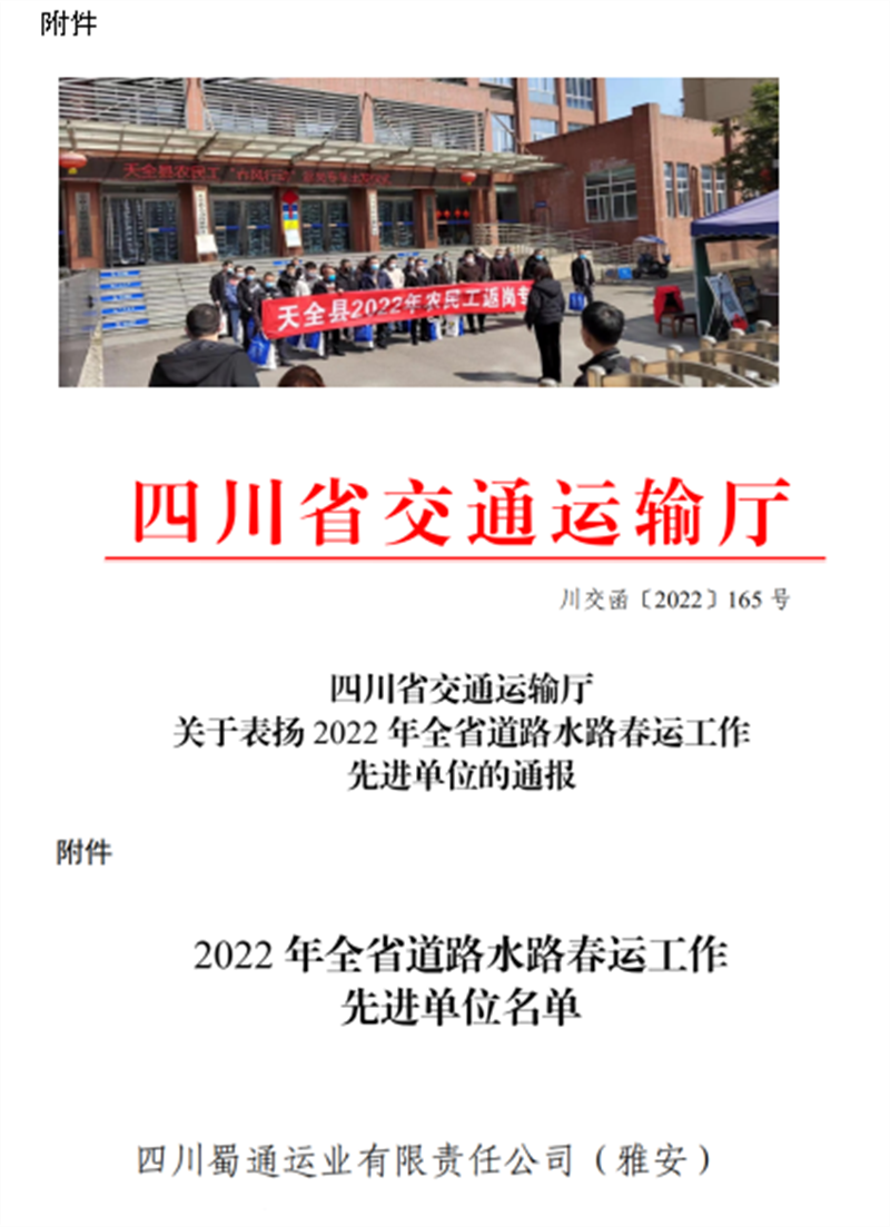 蜀通公司認(rèn)真落實(shí)各級(jí)政府和行業(yè)主管部門(mén)有關(guān)春運(yùn)工作的安排部署,堅(jiān)持以“冬安行動(dòng)”為抓手,全力以赴做好春運(yùn)期間運(yùn)輸安全和疫情防控,確保全市交通運(yùn)輸暢通、民生出行順利。2022年春運(yùn)期間,共投入班線車(chē)輛16546臺(tái),發(fā)班21269班次,其中加班422班次,安全運(yùn)送旅客26余萬(wàn)人次,圓滿完成2022年春運(yùn)工作,被四川省交通運(yùn)輸廳評(píng)為“2022年全省道路水路春運(yùn)工作先進(jìn)單位”。