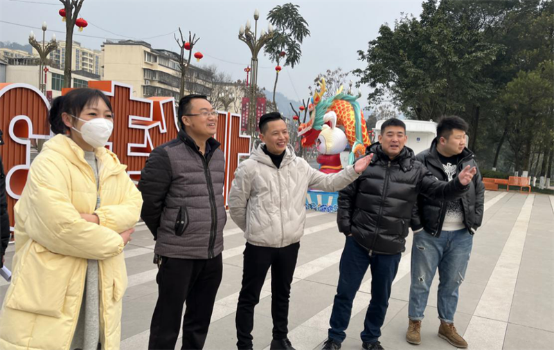 市委宣傳部副部長、市文明辦主任袁嘉偉(左二)實(shí)地查看北緯30度公園LED大屏美化項(xiàng)目現(xiàn)場