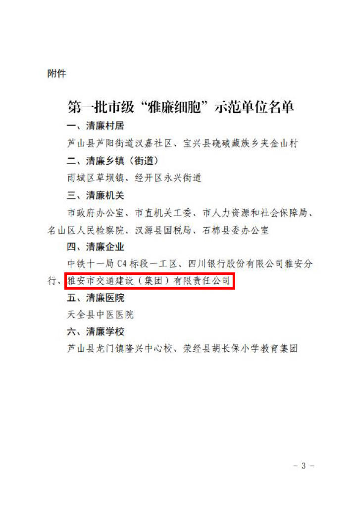 經(jīng)過雅安市黨風廉政建設責任制領導小組辦公室嚴格考評審定,雅安市交通建設(集團)有限責任公司被命名為第一批市級“雅廉細胞”示范單位(清廉企業(yè))。