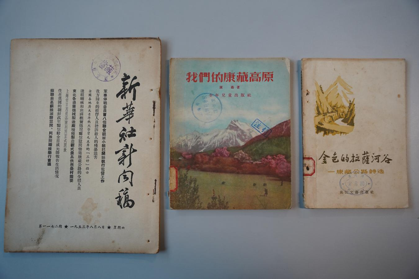 此次獲贈文獻具有重要歷史價值,《金色的拉薩河谷(康藏公路詩選)》以詩歌形式記錄了康藏公路(今川藏公路)建設者的奮斗歷程,其中的不少詩篇被作曲家譜寫成歌曲;《我們的康藏高原》著重描寫了康藏公路的修筑歷程,講述了筑路英雄們的事跡及西藏和平解放后的新面貌;1953年8月8日發(fā)表的新華社新聞稿原件,以第一手資料還原了康藏公路修建期間的重要歷史節(jié)點。