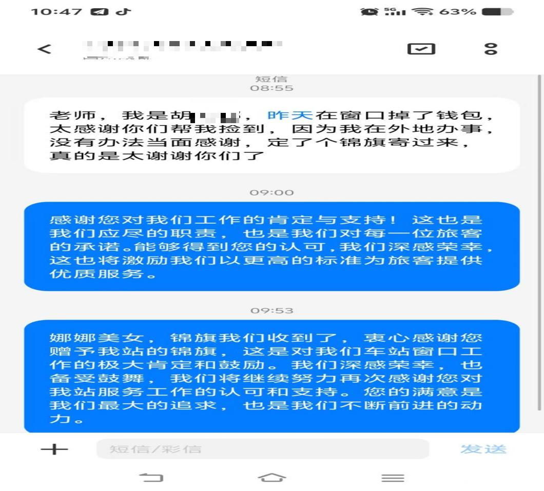 5月14日11時(shí)11分,售票員郝凌云發(fā)現(xiàn)柜臺(tái)上遺留了一個(gè)卡包,內(nèi)有現(xiàn)金 300 元、多張銀行卡、身份證及社?ǖ戎匾锲。郝凌云第一時(shí)間上報(bào)值班科長,通過站務(wù)系統(tǒng)比對購票信息,僅用5分鐘便鎖定失主為即將前往漢源的旅客胡女士,此時(shí)胡女士正在等待檢票,尚未察覺錢包丟失。值班站長通過廣播系統(tǒng)緊急尋人,胡女士聽到廣播后立即前往值班室認(rèn)領(lǐng)物品,經(jīng)值班科長仔細(xì)核對身份及物品信息后,將卡包完好歸還。胡女士激動(dòng)致謝:“太感謝你了!你們汽車站的工作人員素質(zhì)真高,太讓人暖心了!”