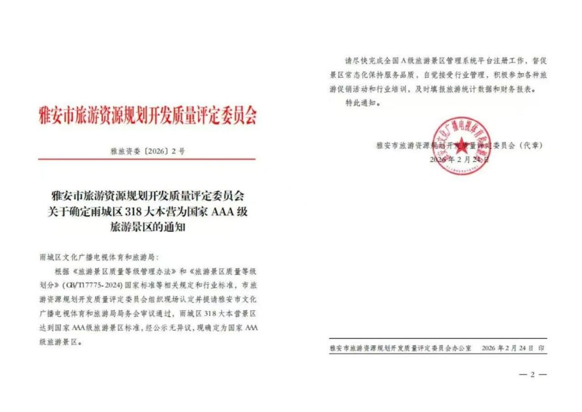 2月24日,經(jīng)雅安市文化廣播電視體育和旅游局局務(wù)會審議通過,中國·雅安318自駕大本營正式被確定為國家AAA級旅游景區(qū)。