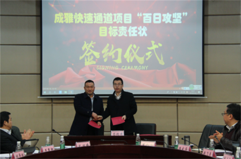 會上,項目公司介紹了項目建設(shè)情況;市交通運(yùn)輸局安排布置了“百日攻堅”活動;中建三局、六局、參建單位分別發(fā)言,建設(shè)單位分別與各標(biāo)段簽訂“百日攻堅”責(zé)任狀,會議在嚴(yán)肅又緊張的氛圍下進(jìn)行。