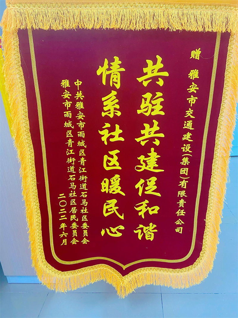6月29日,雅安市交建集團(tuán)作為石馬社區(qū)結(jié)對(duì)共建先進(jìn)單位,受邀參加了中共雅安市雨城區(qū)青江街道石馬社區(qū)工作委員會(huì)組織召開的慶祝建黨101周年大會(huì)暨2022年度先進(jìn)表彰大會(huì),石馬社區(qū)黨委書記周麗娟同志為交建集團(tuán)贈(zèng)送“情系社區(qū)解難事 共駐共建促和諧”錦旗。