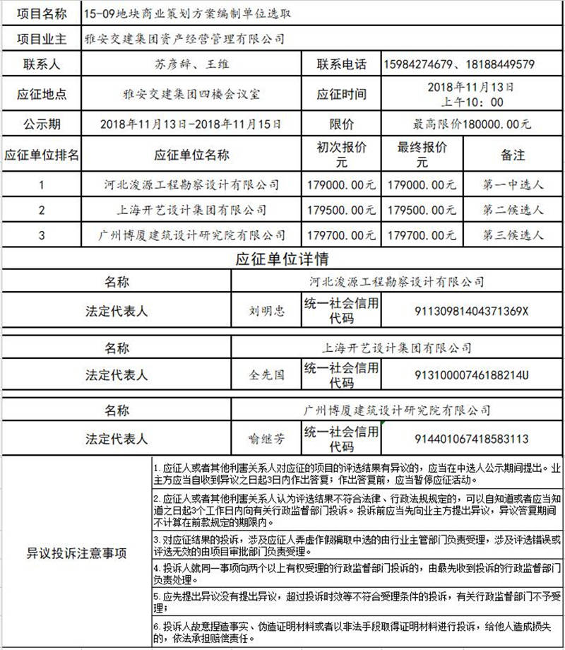 雅安交建集團(tuán)資產(chǎn)經(jīng)營(yíng)管理有限公司15-09地塊商業(yè)策劃方案編制單位選取結(jié)果公示