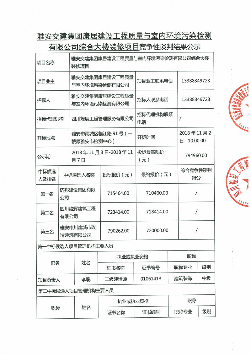雅安交建集團(tuán)康居建設(shè)工程質(zhì)量與室內(nèi)環(huán)境污染檢測有限公司綜合大樓裝修項目競爭性談判結(jié)果公示