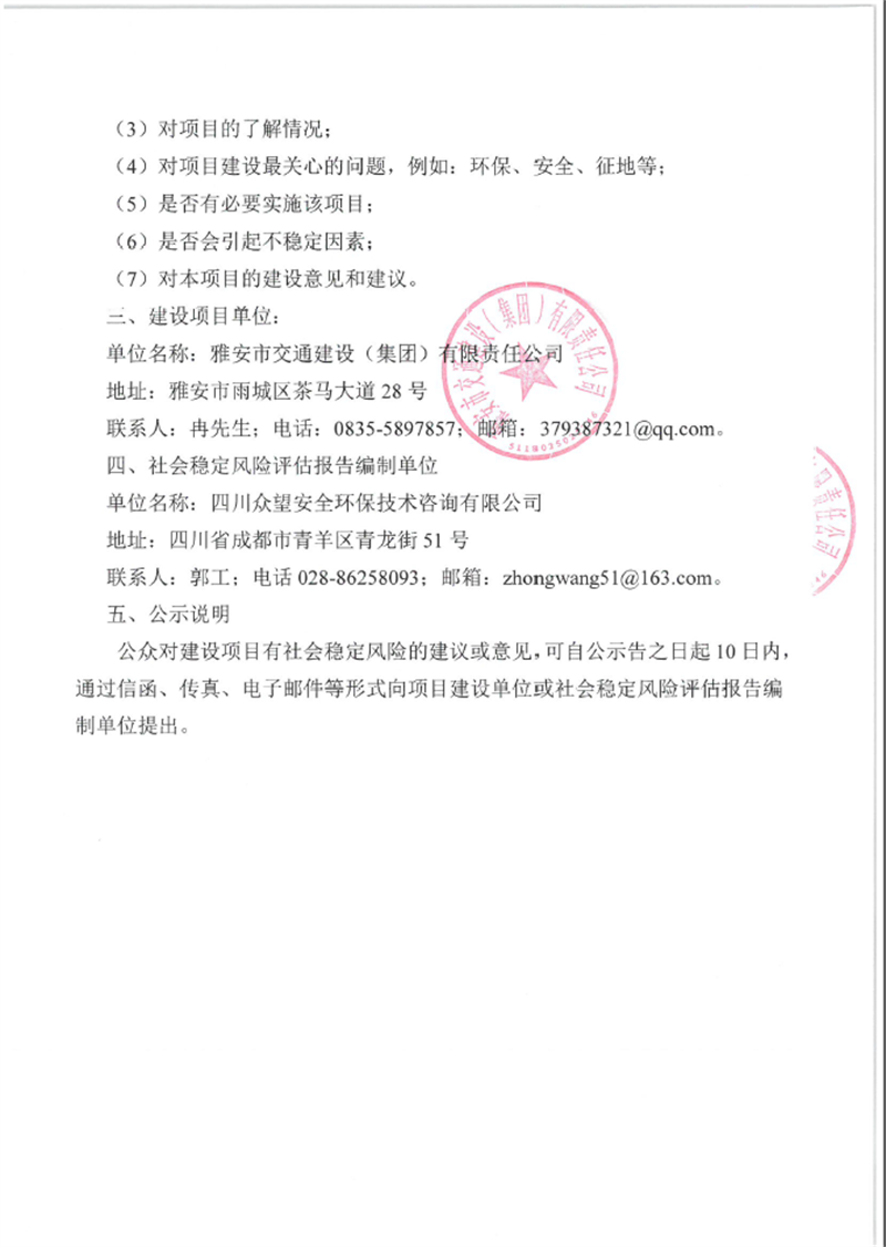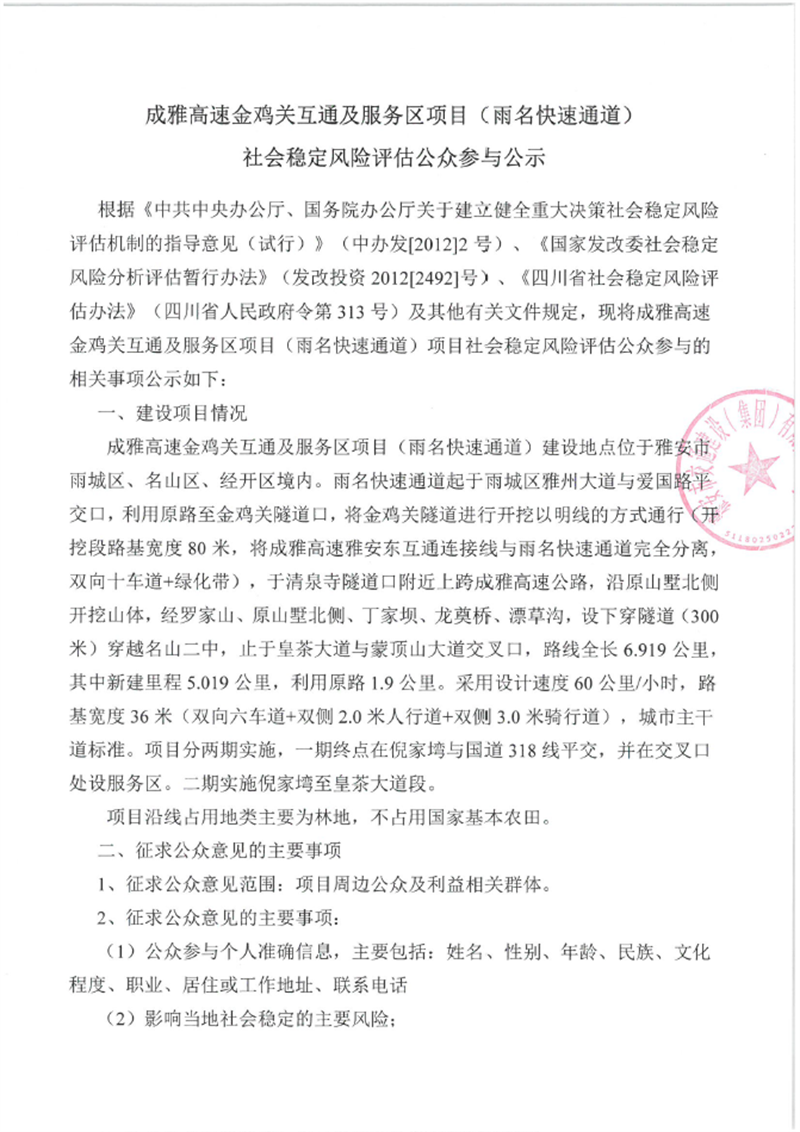 成雅高速金雞關(guān)互通及服務(wù)區(qū)項目(雨名快速通道)社會穩(wěn)定風險評估公眾參與公示