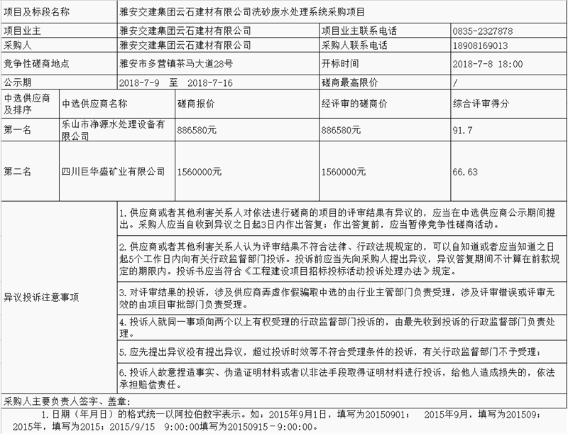 雅安交建集團(tuán)云石建材有限公司洗砂廢水處理系統(tǒng)采購項(xiàng)目中選供應(yīng)商公示