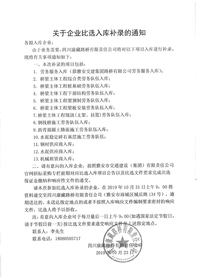 四川康藏路橋有限責(zé)任公司關(guān)于企業(yè)比選入庫補(bǔ)錄的通知