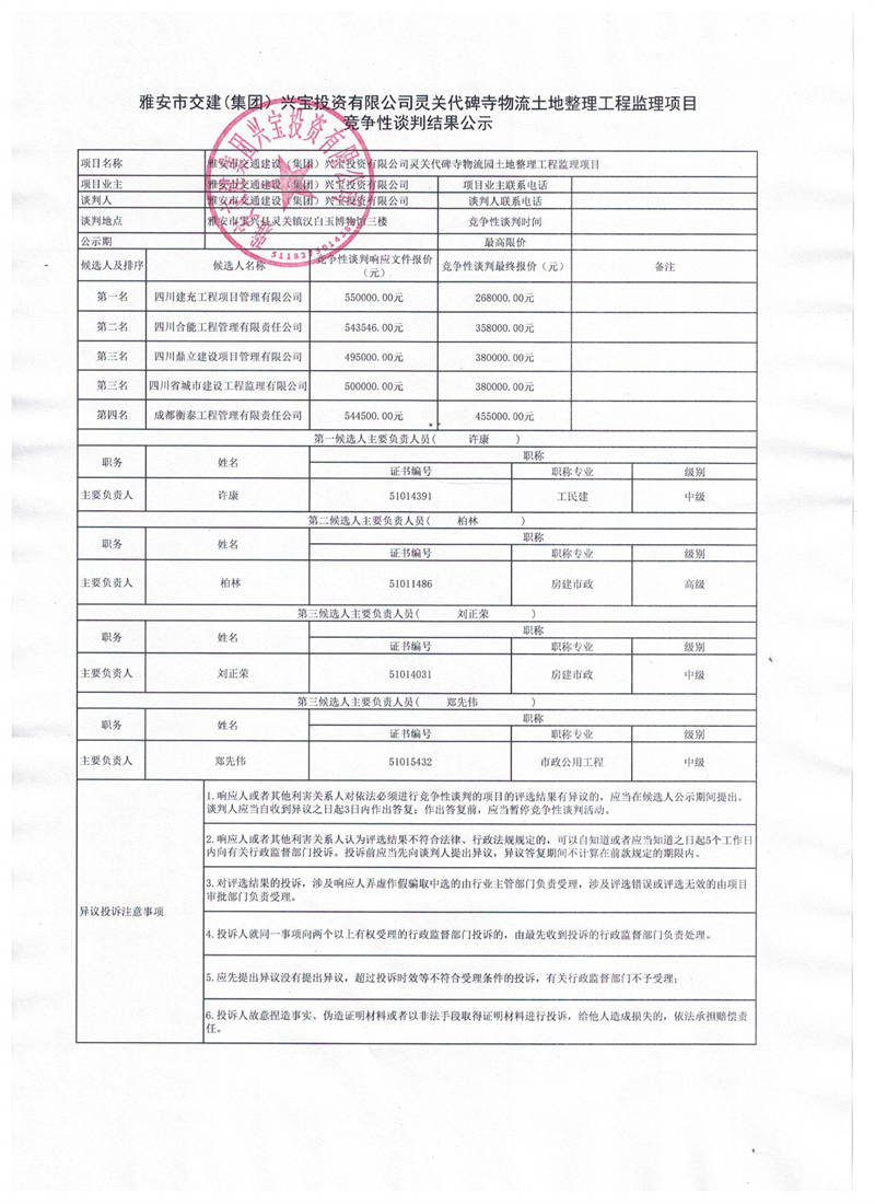 雅安交建集團興寶投資有限公司寶興縣靈關代碑寺物流園土地整理工程監(jiān)理項目競爭性談判結果公示