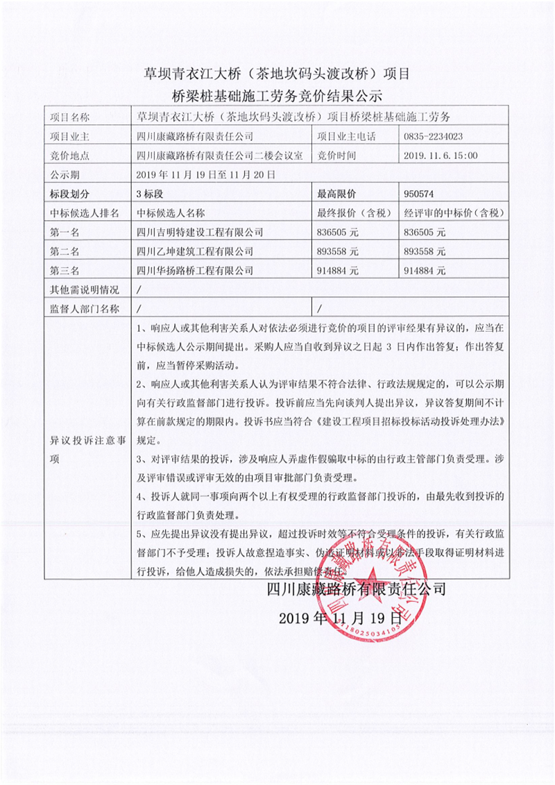 四川康藏路橋有限責(zé)任公司草壩青衣江大橋(茶地坎碼頭渡改橋)項(xiàng)目橋梁樁基礎(chǔ)施工勞務(wù)競價(jià)(3標(biāo)段)結(jié)果公示