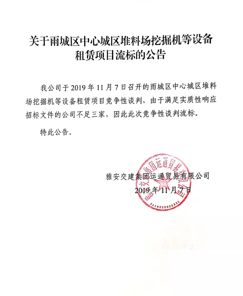 雅安交建集團(tuán)運(yùn)通貿(mào)易有限公司關(guān)于雨城區(qū)中心城區(qū)堆料場挖掘機(jī)等設(shè)備租賃項(xiàng)目流標(biāo)的公告