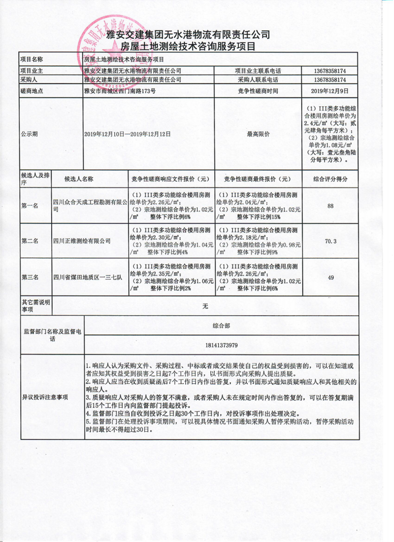 雅安交建集團(tuán)無水港物流有限責(zé)任公司房屋土地測(cè)繪技術(shù)咨詢服務(wù)項(xiàng)目競(jìng)爭(zhēng)性磋商結(jié)果公示