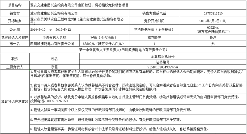 雅安交建集團興寶投資有限公司廢舊鐵塔、銅芯鋁線競價銷售項目公示
