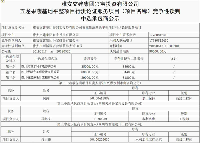 雅安交建集團(tuán)興寶投資有限公司五龍果蔬基地平整項(xiàng)目行洪論證服務(wù)項(xiàng)目(項(xiàng)目名稱)競(jìng)爭(zhēng)性談判 中選承包商公示