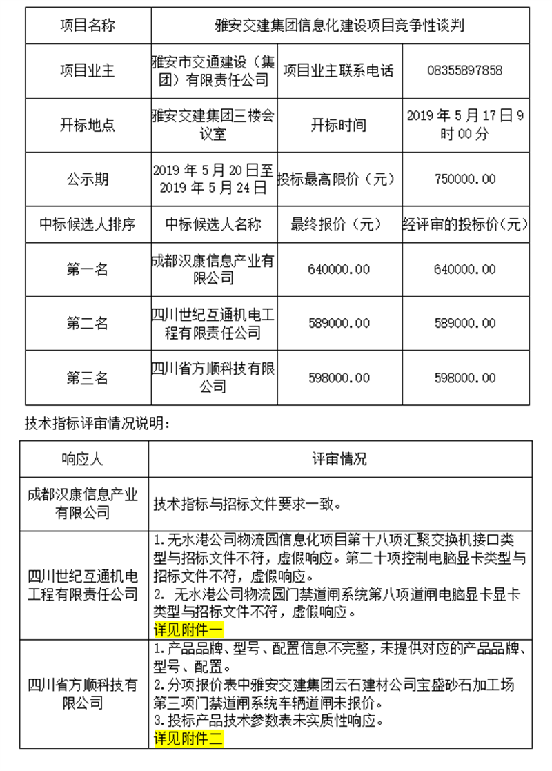 雅安交建集團信息化建設項目競爭性談判評標結果公示