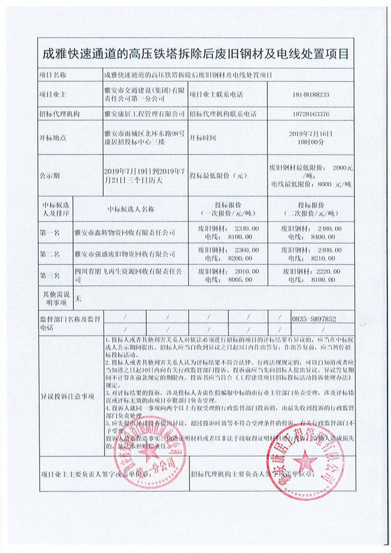 雅安市交通建設(shè)(集團)有限責(zé)任公司第一分公司成雅快速通道的高壓鐵塔拆除后廢舊鋼材及電線處置項目競價結(jié)果公示