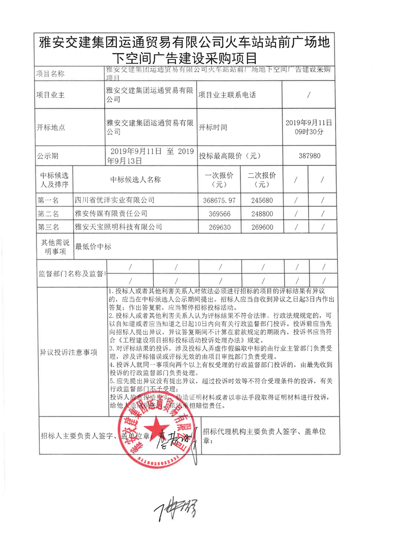 雅安交建集團(tuán)運(yùn)通貿(mào)易有限公司火車站站前廣場地下空間廣告建設(shè)采購項(xiàng)目結(jié)果公示