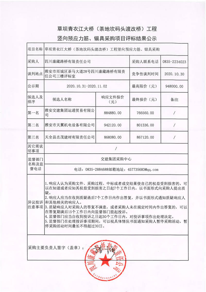 四川康藏路橋有限責(zé)任公司草壩青衣江大橋(茶地坎碼頭渡改橋)工程豎向預(yù)應(yīng)力筋、錨具采購項目評標(biāo)結(jié)果公示