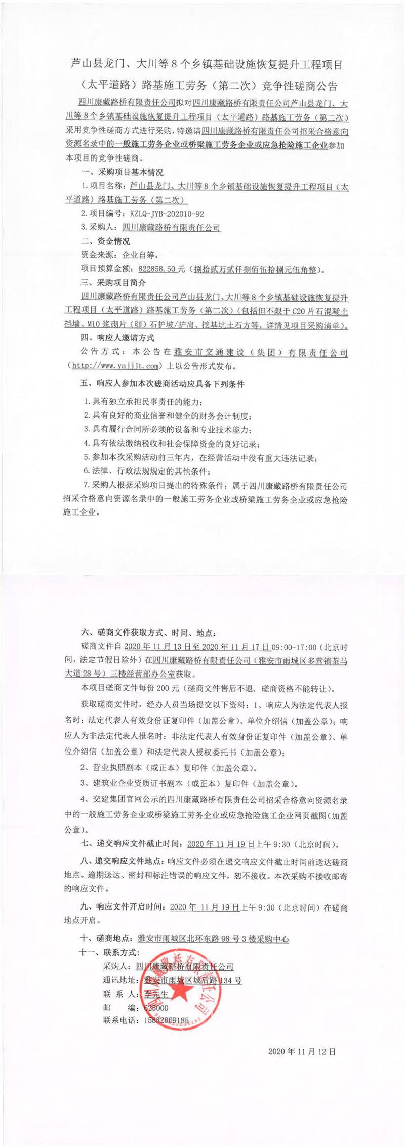 四川康藏路橋有限責任公司蘆山縣龍門、大川等8個鄉(xiāng)鎮(zhèn)基礎設施恢復提升工程項目(太平道路)路基施工勞務(第二次)競爭性磋商公告