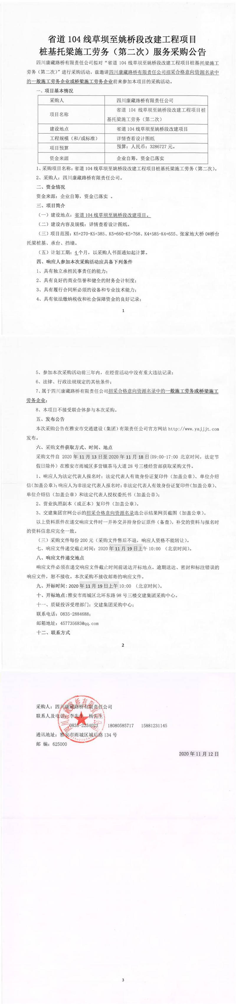 四川康藏路橋有限責(zé)任公司省道104線(xiàn)草壩至姚橋段改建工程項(xiàng)目樁基托梁施工勞務(wù)(第二次)服務(wù)采購(gòu)公告