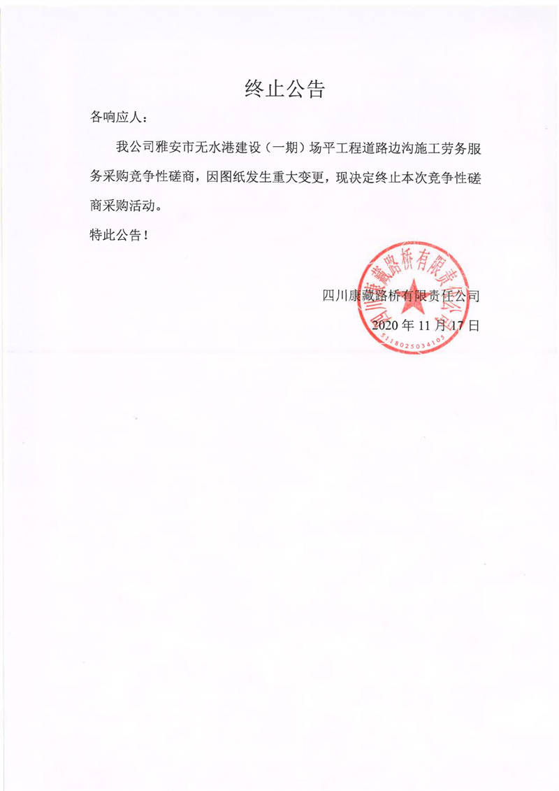 四川康藏路橋有限責任公司雅安市無水港建設(shè)(一期)場平工程道路邊溝施工勞務(wù)服務(wù)采購終止公告