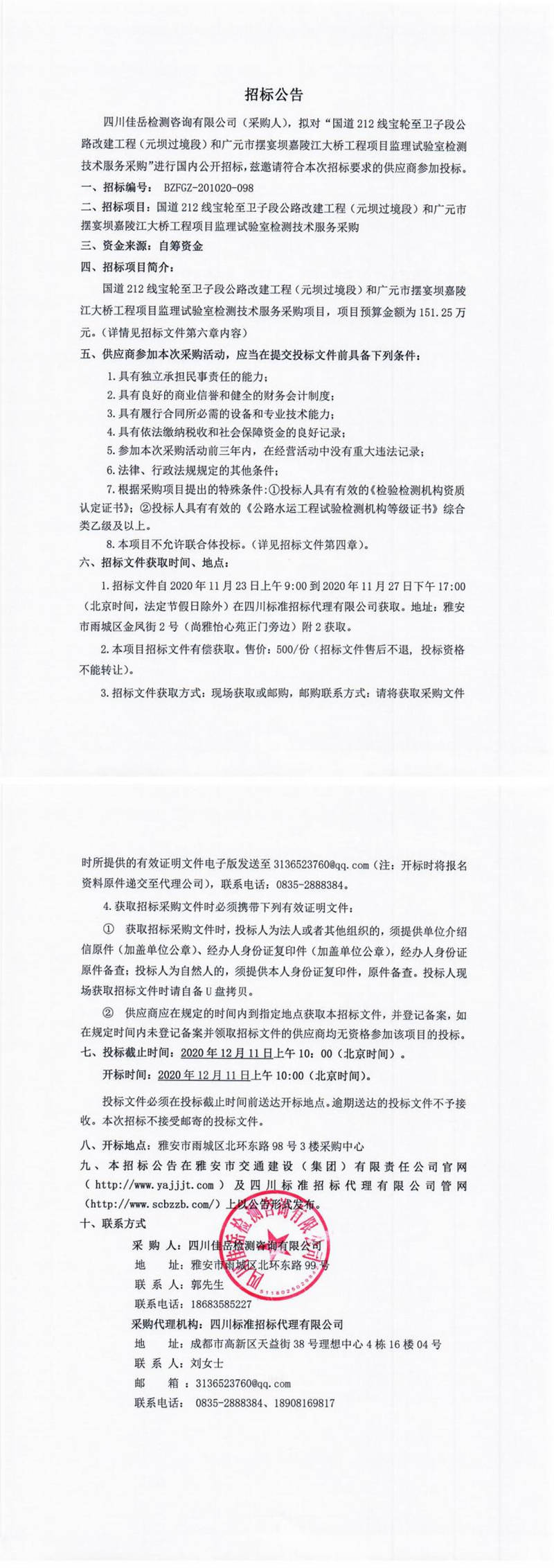 四川佳岳檢測(cè)咨詢有限公司國(guó)道212線寶輪至衛(wèi)子段公路改建工程(元壩過境段)和廣元市擺宴壩嘉陵江大橋工程項(xiàng)目監(jiān)理試驗(yàn)室檢測(cè)技術(shù)服務(wù)采購招標(biāo)公告