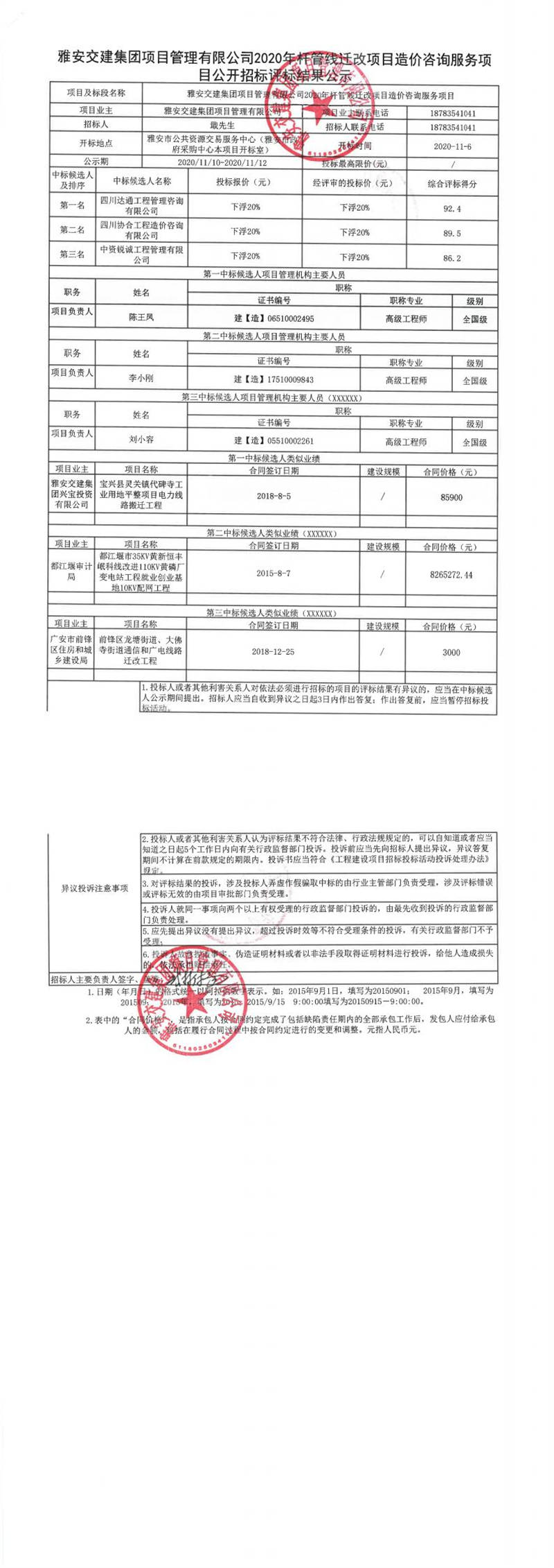 雅安交建集團項目管理有限公司2020年桿管線遷改項目造價咨詢服務項目公開招標評標結果公示