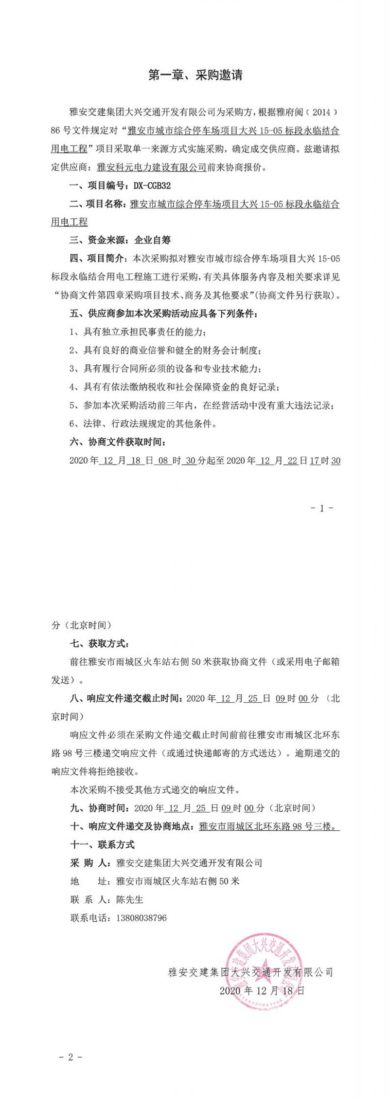 雅安交建集團大興交通開發(fā)有限公司雅安市城市綜合停車場項目大興15-05標(biāo)段永臨結(jié)合用電工程單一來源采購邀請