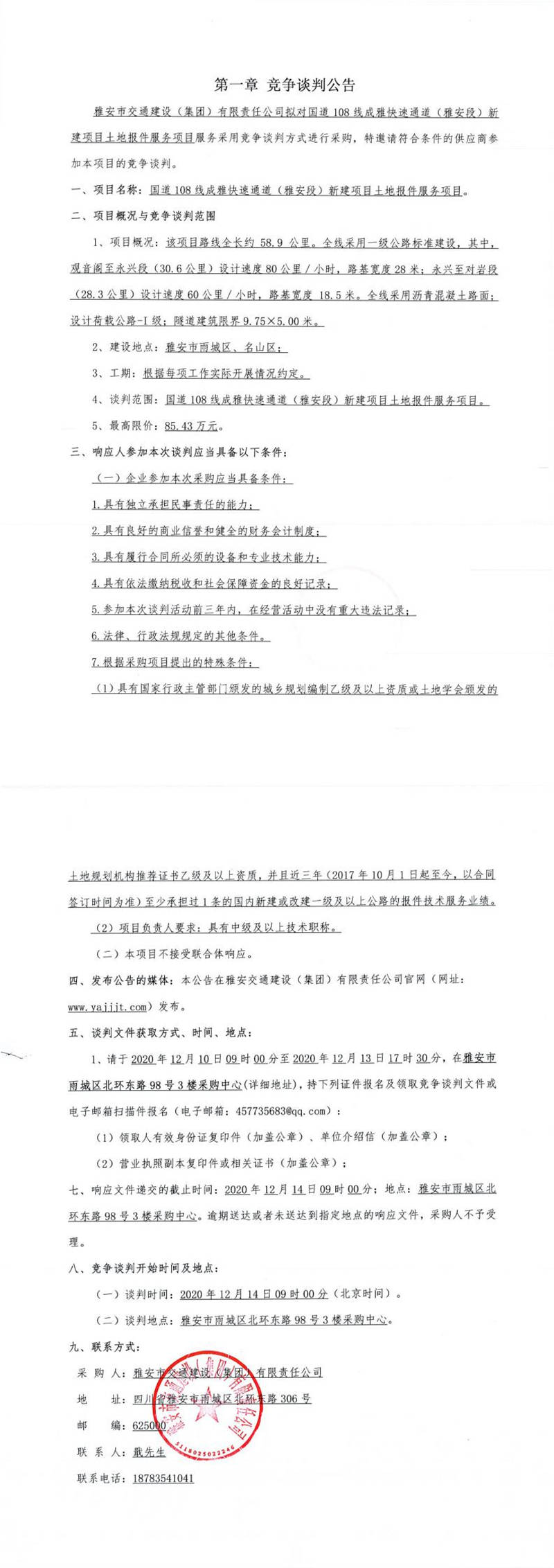雅安市交通建設(shè)(集團(tuán))有限責(zé)任公司國(guó)道108線成雅快速通道(雅安段)新建項(xiàng)目土地報(bào)件服務(wù)項(xiàng)目競(jìng)爭(zhēng)談判公告
