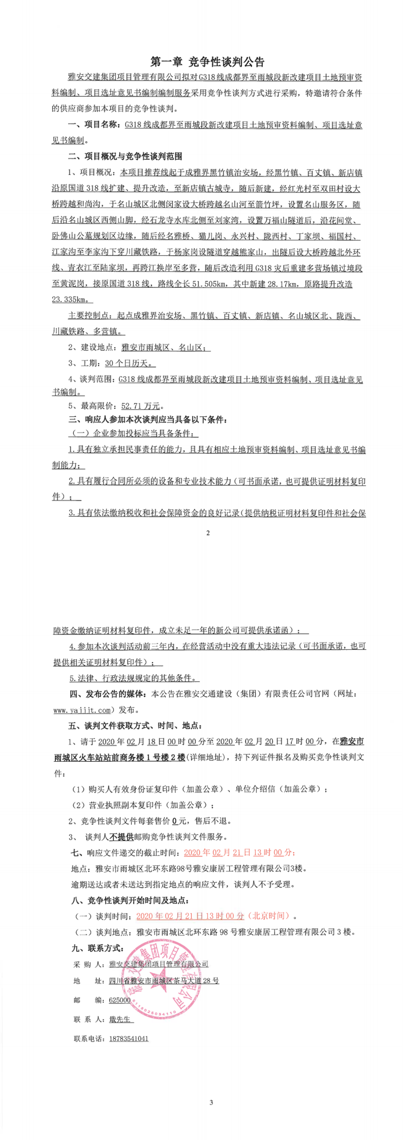 雅安交建集團(tuán)項(xiàng)目管理有限公司G318線成都界至雨城段新改建項(xiàng)目土地預(yù)審資料編制、項(xiàng)目選址意見書編制競爭性談判公告