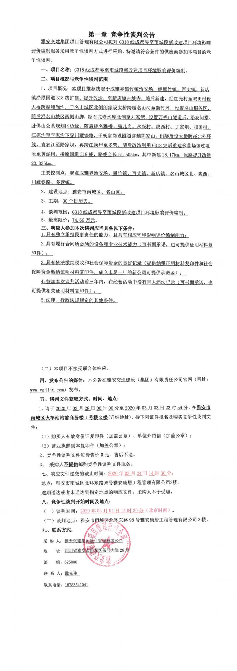 雅安交建集團(tuán)項(xiàng)目管理有限公司G318線成都界至雨城段新改建項(xiàng)目環(huán)境影響評(píng)價(jià)編制競(jìng)爭(zhēng)性談判公告