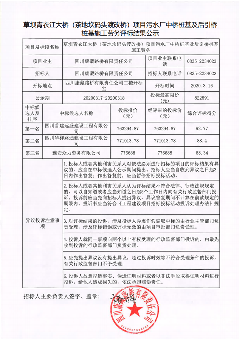 四川康藏路橋有限責任公司草壩青衣江大橋(茶地坎碼頭渡改橋)項目污水廠中橋樁基及后引橋樁基施工勞務評標結果公示