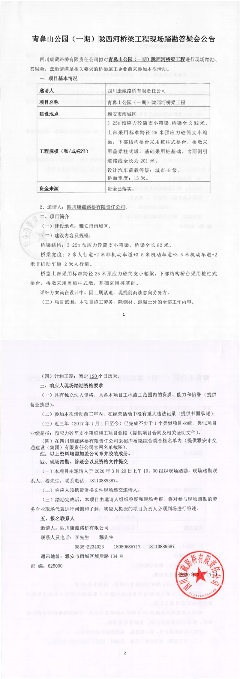 四川康藏路橋有限責(zé)任公司青鼻山公園(一期)隴西河橋梁工程現(xiàn)場踏勘答疑會公告
