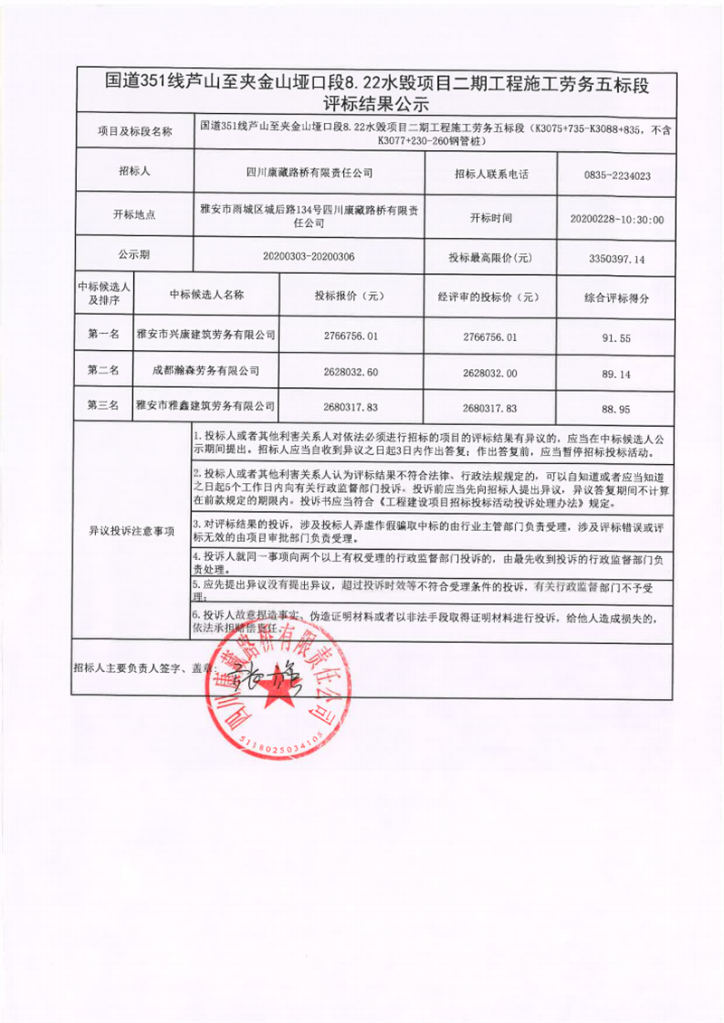 四川康藏路橋有限責(zé)任公司國道351線蘆山至夾金山埡口段8.22水毀項(xiàng)目二期工程施工勞務(wù)五標(biāo)段評(píng)標(biāo)結(jié)果公示