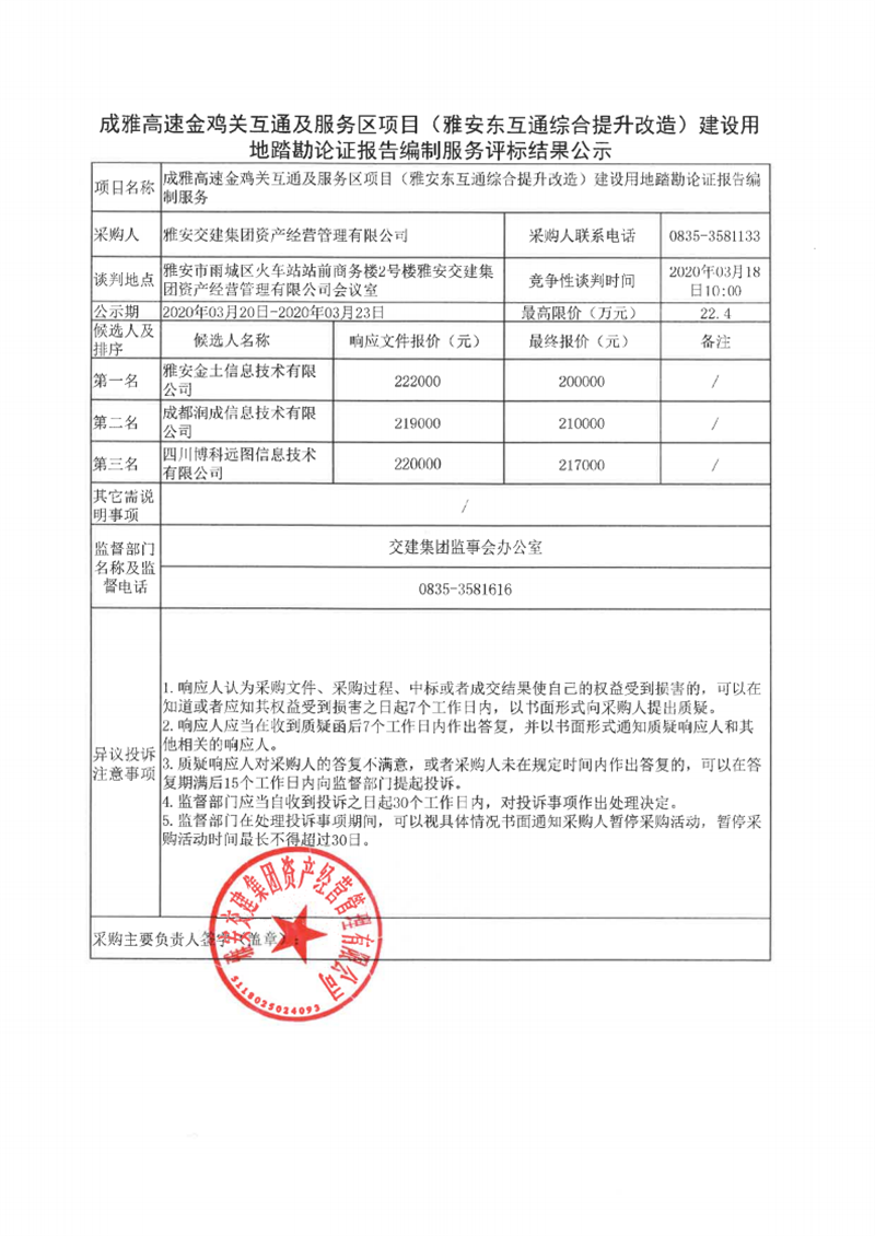 雅安交建集團(tuán)資產(chǎn)經(jīng)營管理有限公司成雅高速金雞關(guān)互通及服務(wù)區(qū)項(xiàng)目(雅安東互通綜合提升改造)建設(shè)用地踏勘論證報(bào)告編制服務(wù)評標(biāo)結(jié)果公示