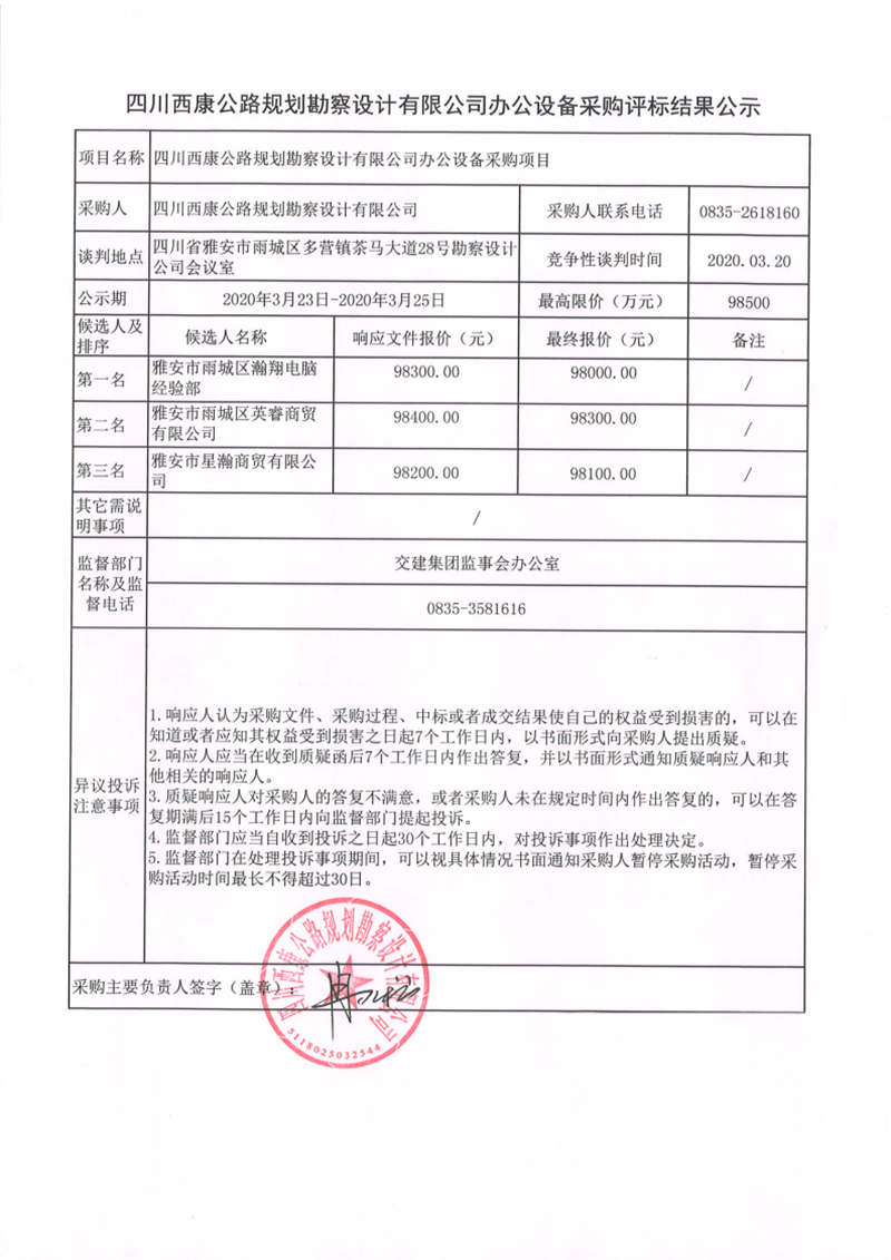 四川西康公路規(guī)劃勘察設(shè)計(jì)有限公司辦公設(shè)備采購評標(biāo)結(jié)果公示