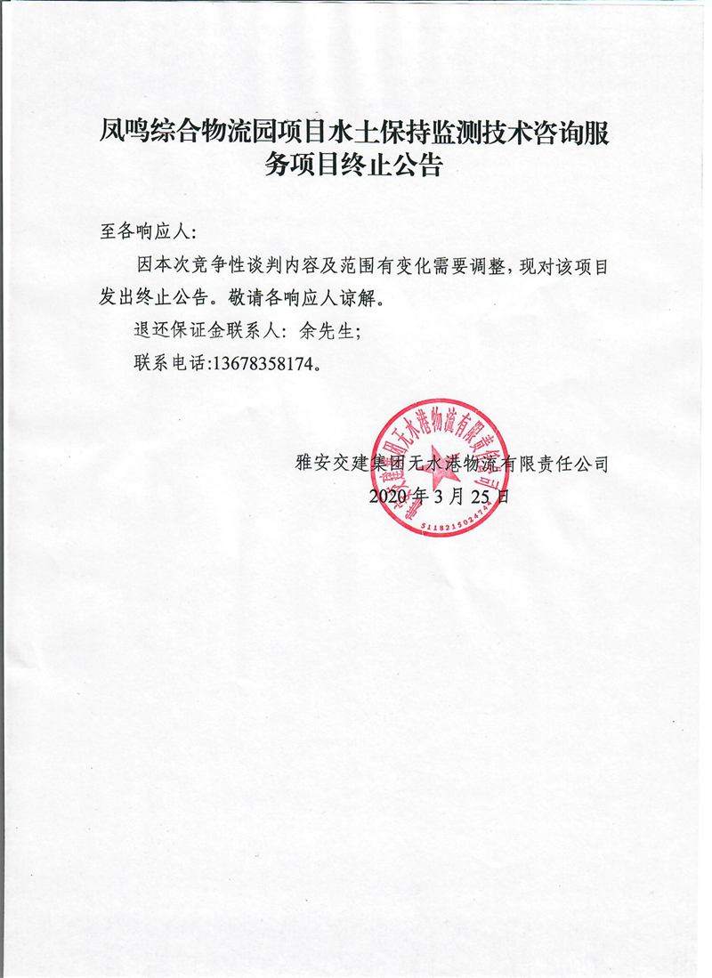 雅安交建集團(tuán)無(wú)水港物流有限責(zé)任公司鳳鳴綜合物流園項(xiàng)目水土保持監(jiān)測(cè)技術(shù)咨詢服務(wù)項(xiàng)目終止公告