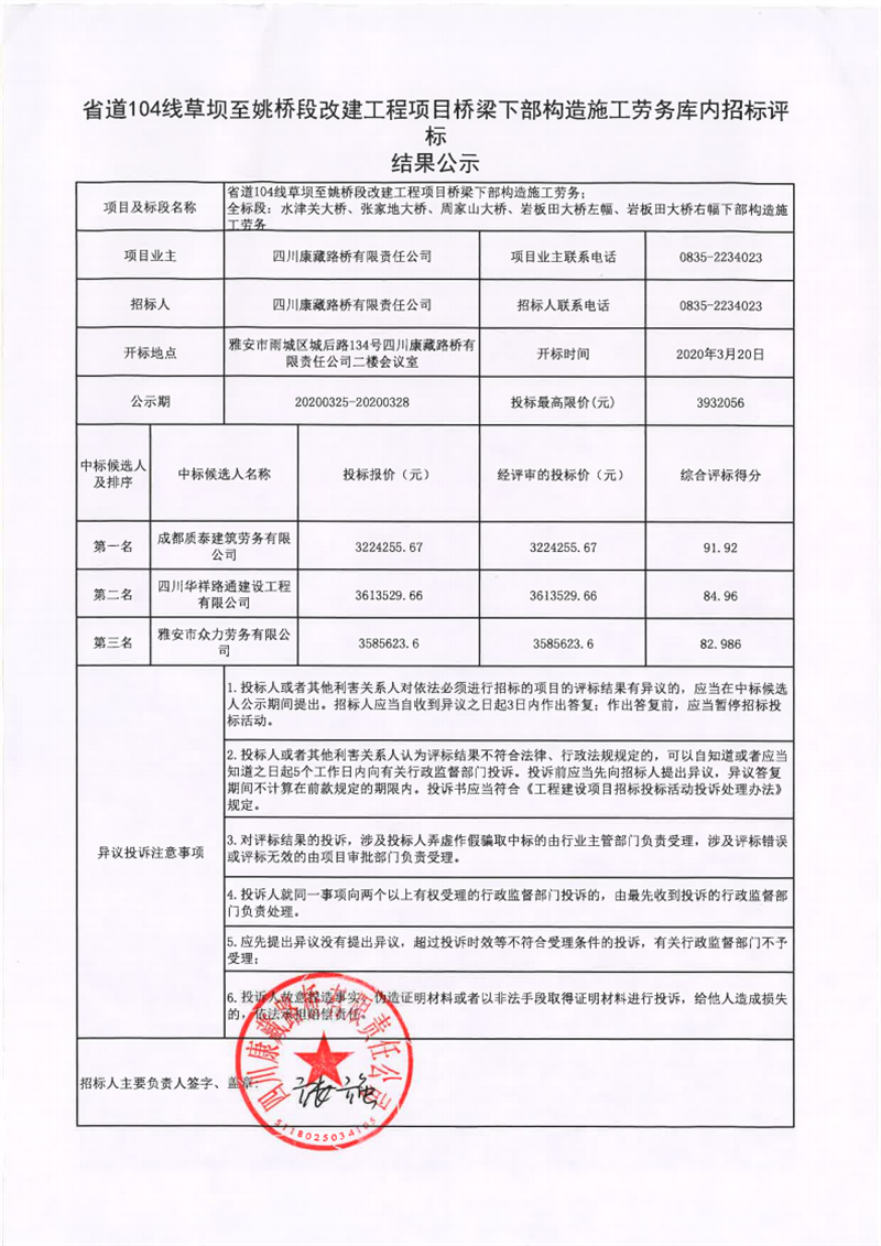 四川康藏路橋有限責任公司省道104線草壩至姚橋段改建工程項目橋梁下部構(gòu)造施工勞務評標結(jié)果公示