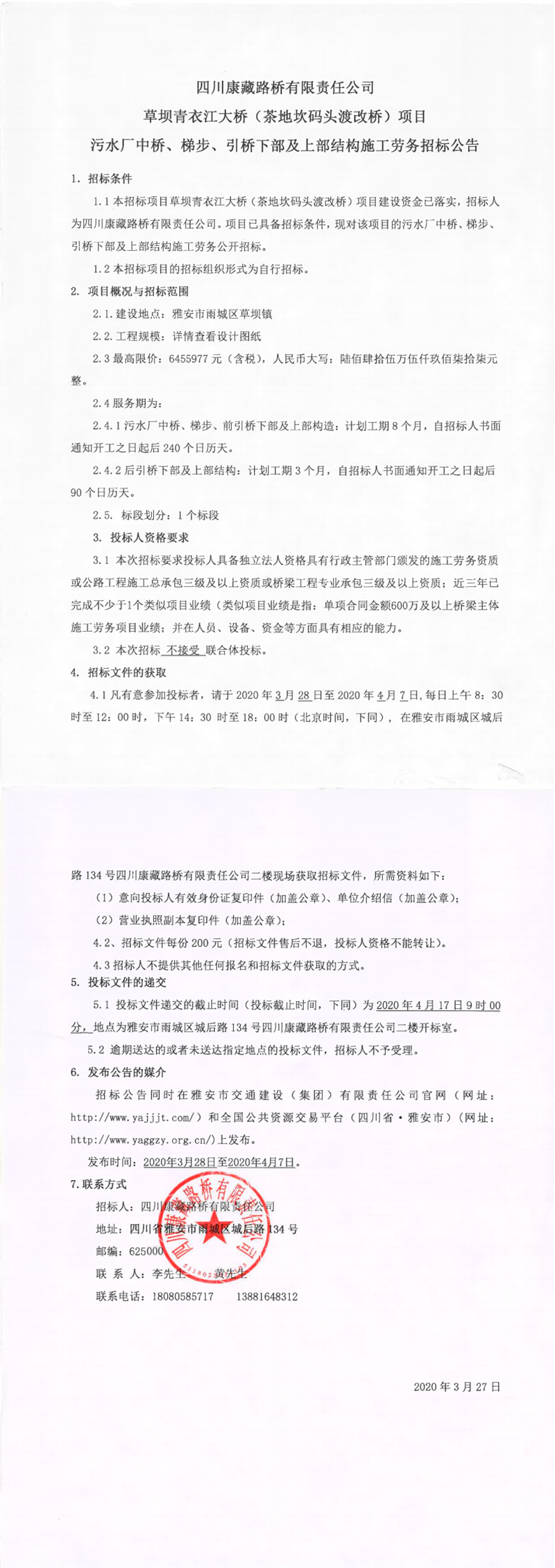 四川康藏路橋有限責(zé)任公司草壩青衣江大橋(茶地坎碼頭渡改橋)項目主橋墩柱及上部結(jié)構(gòu)施工勞務(wù)招標(biāo)公告