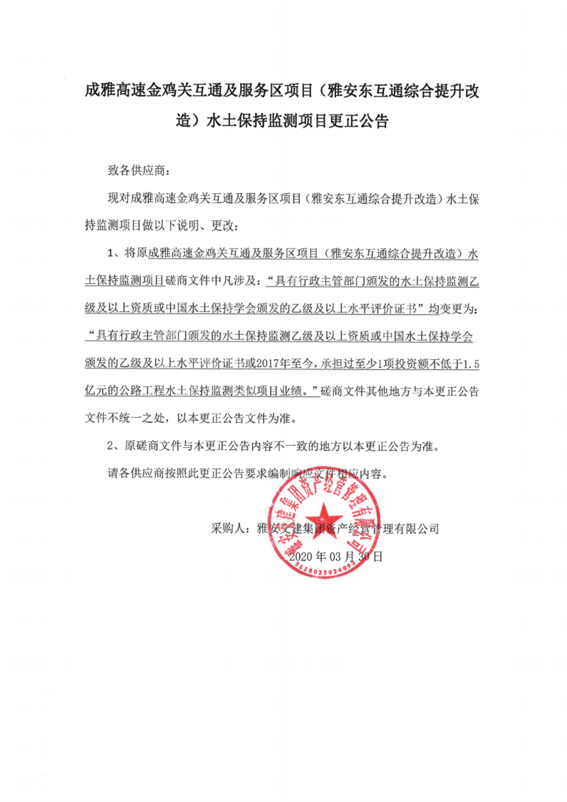 雅安交建集團資產經營管理有限公司成雅高速金雞關互通及服務區(qū)項目(雅安東互通綜合提升改造)水土保持監(jiān)測項目更正公告
