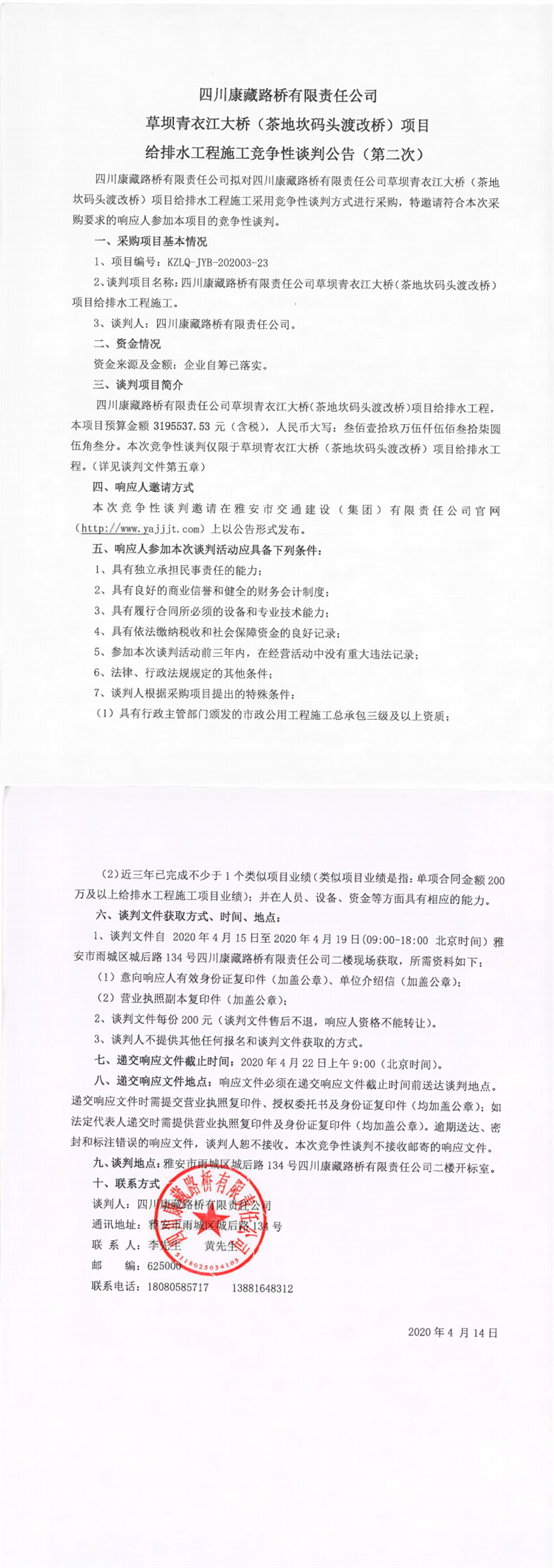 四川康藏路橋有限責(zé)任公司草壩青衣江大橋(茶地坎碼頭渡改橋)項(xiàng)目給排水工程施工競(jìng)爭(zhēng)性談判公告(第二次)