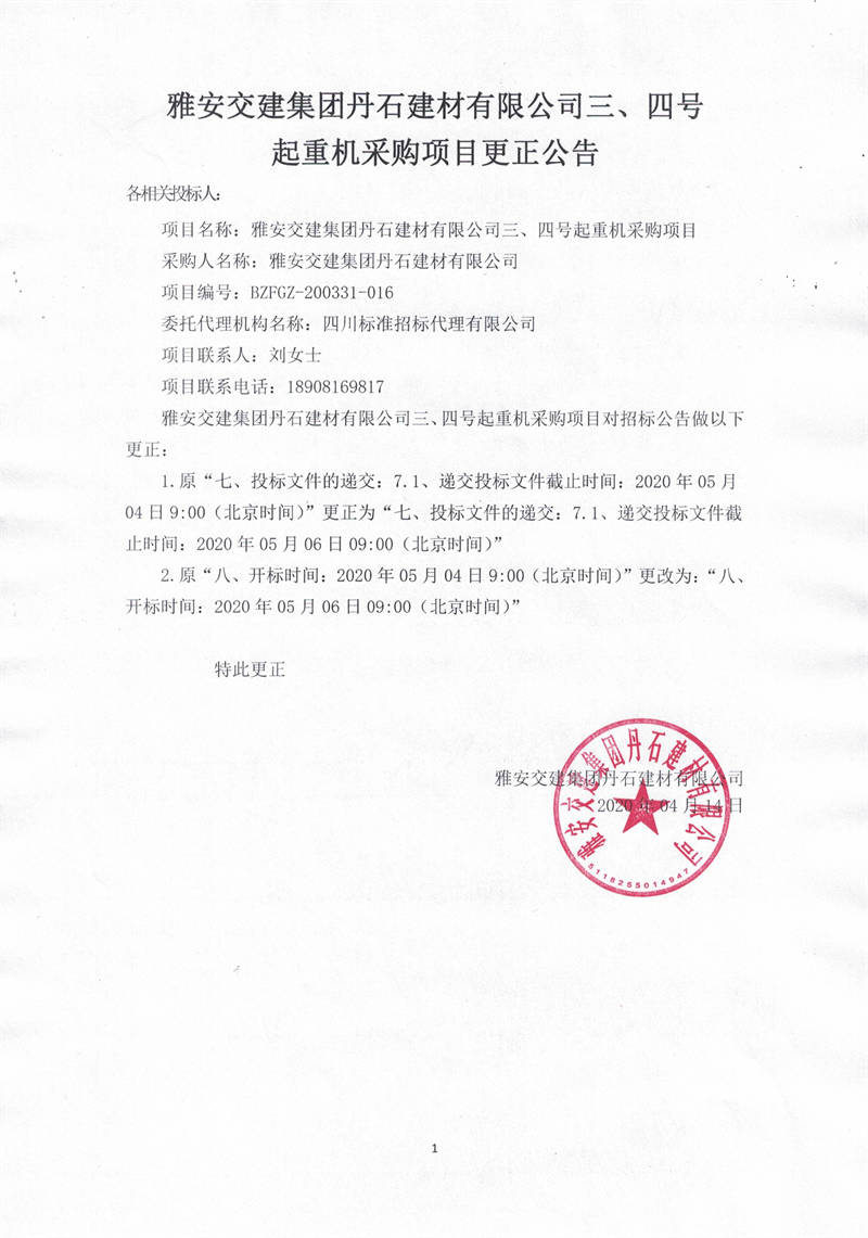 雅安交建集團(tuán)丹石建材有限公司三、四號起重機(jī)采購項(xiàng)目更正公告