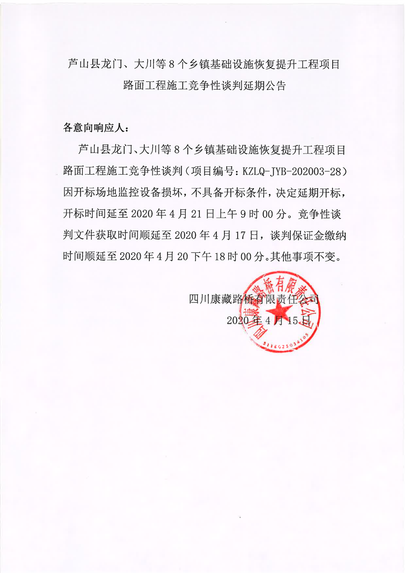 四川康藏路橋有限責任公司蘆山縣龍門、大川等8個鄉(xiāng)鎮(zhèn)基礎(chǔ)設(shè)施恢復提升工程項目路面工程施工競爭性談判延期公告