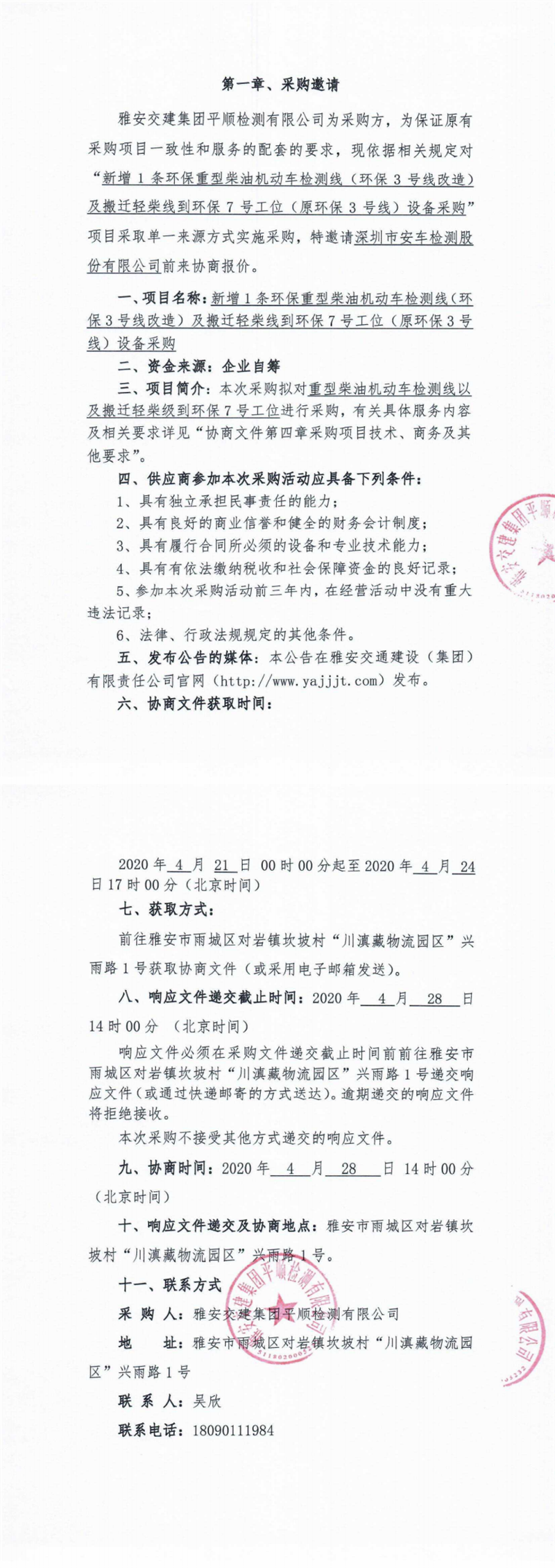 雅安交建集團(tuán)平順檢測有限公司新增1條環(huán)保重型柴油機(jī)動(dòng)車檢測線(環(huán)保3號(hào)線改造)及搬遷輕柴線到環(huán)保7號(hào)工位(原環(huán)保3號(hào)線)設(shè)備采購單一來源協(xié)商公告