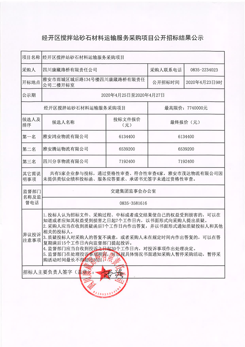 四川康藏路橋有限責任公司經開區(qū)攪拌站砂石材料運輸服務采購項目公開招標結果公示