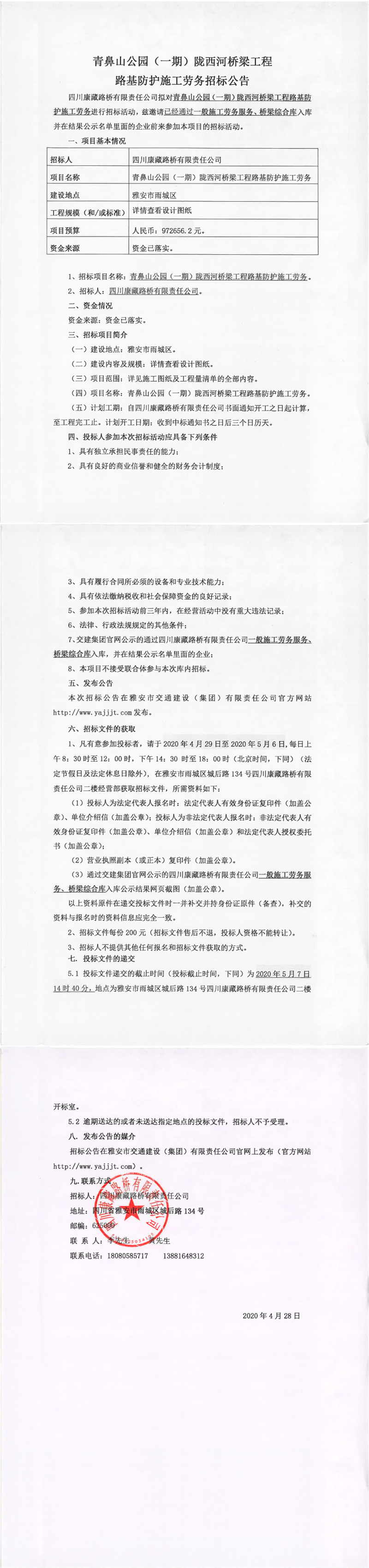四川康藏路橋有限責(zé)任公司青鼻山公園(一期)隴西河橋梁工程路基防護施工勞務(wù)招標(biāo)公告